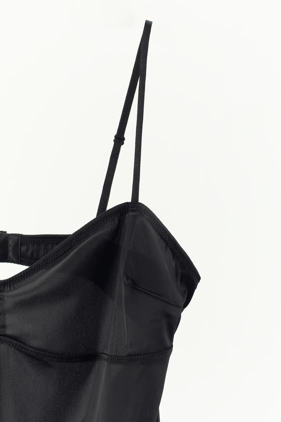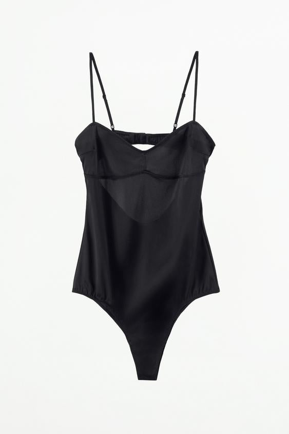 Body avec décolleté en cœur et bretelles fines réglables. Fermeture par boutons-pression à l’entrejambe et par crochets métalliques au dos.