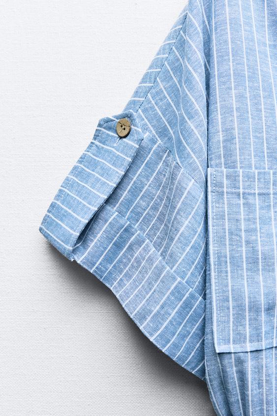 Combinaison avec lin. Col à revers, décolleté en V et manches courtes à revers avec patte boutonnée. Poches avant. Taille élastique au dos. Fermeture à l’avant par zip et boutons.