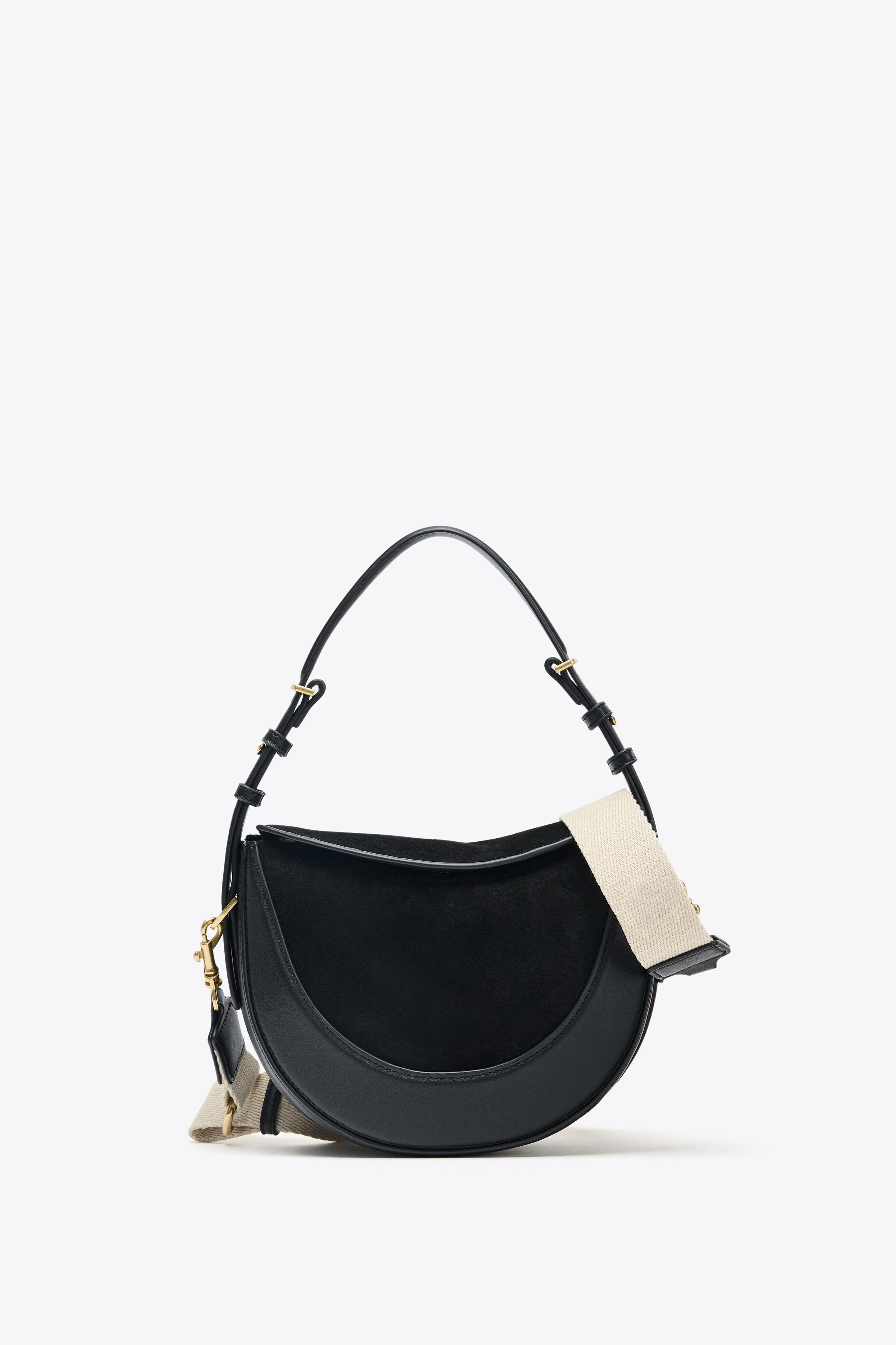 Oval shoulder bag in a combination of materials with a leather flap. Double round strap handle with metallic details.