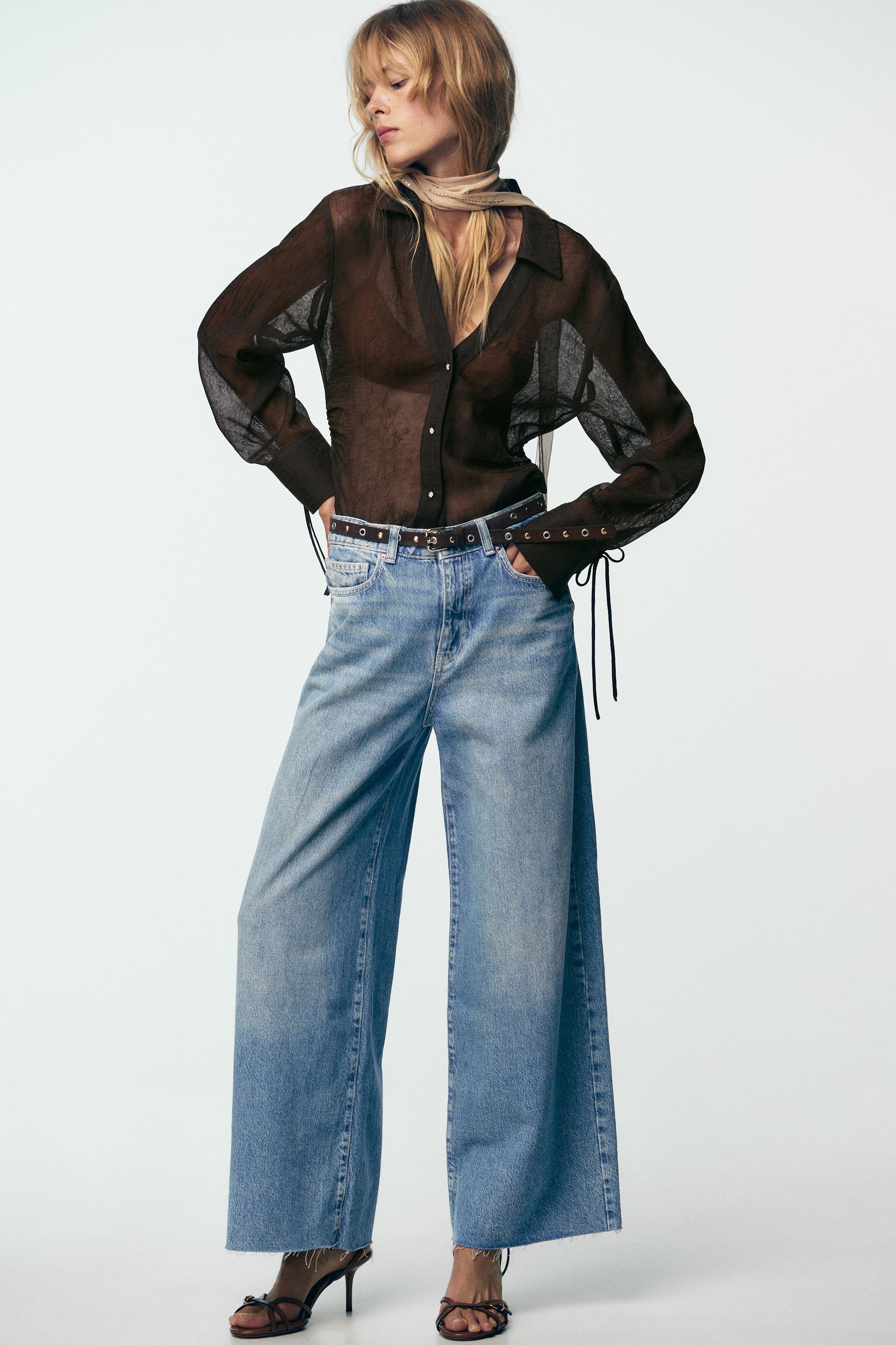 Collared shirt with a V-neck. Long sleeves finished with ties. Fitted waist detail with ruching. Front fastening with jewelled buttons.